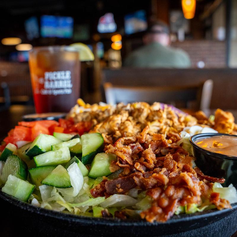Each Basket and Entree comes with a side. Choose a Side: Cheese Grits | Cheesy Potato Soup | Chili |1/4 lb Beer Battered Fries | 1/4 lb. Naked Fries | Fried Okra | Small Tossed Salad | Caesar Salad | Pasta Salad | PBC Baked Beans | PBC Power Veggies | Kettle Chips | Baked Potato with B & SC | Baby Greek Salad +$1.50
